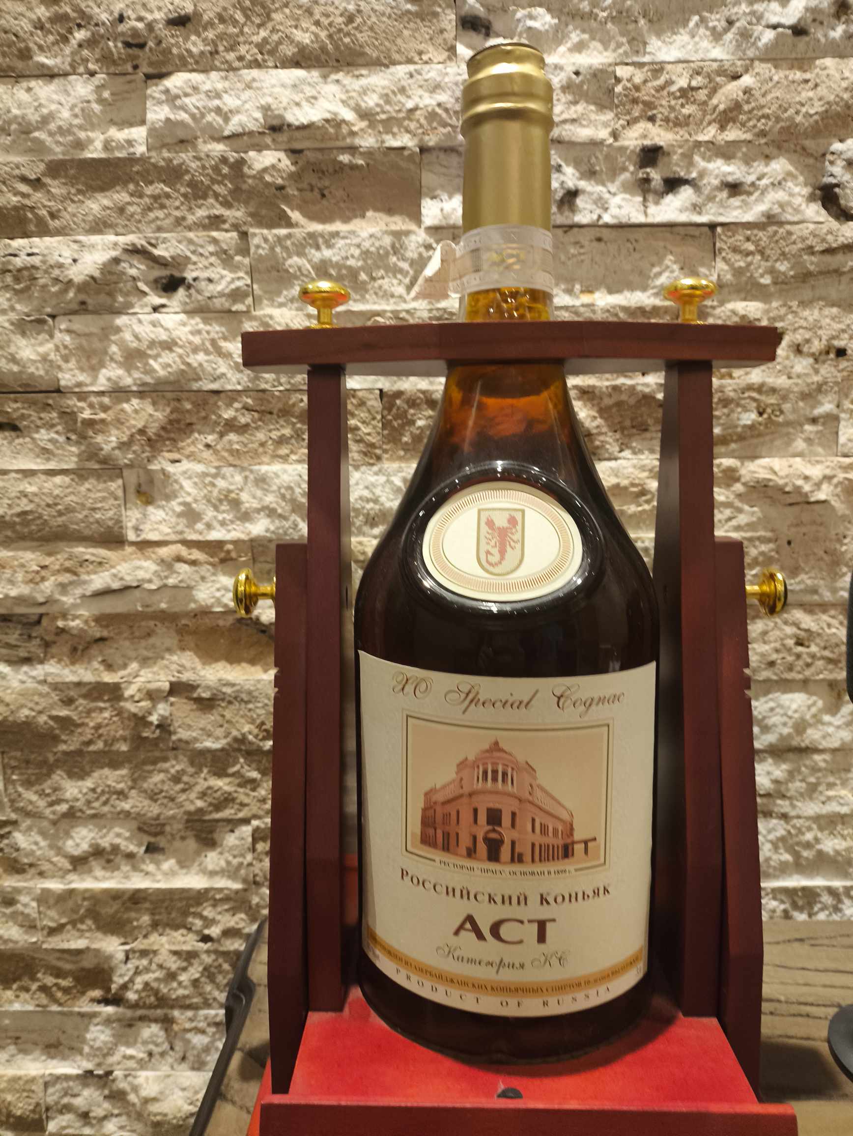 1. "Коньяк Российский категории КС " АСТ "  XO Spesial Cognac. По этикетке изготовлен из "Отборных Азербайджанских коньячных спиртов возрастом не менее 10 лет" производства ЗАО "Мосазеривинзавод". Попало ко мне, по легенде от бывшего сушефа ресторана "Прага" в Москве, выкуплен из семьи. Объем 3 лтр. Подставка представленная на фотографии шла в комплекте.