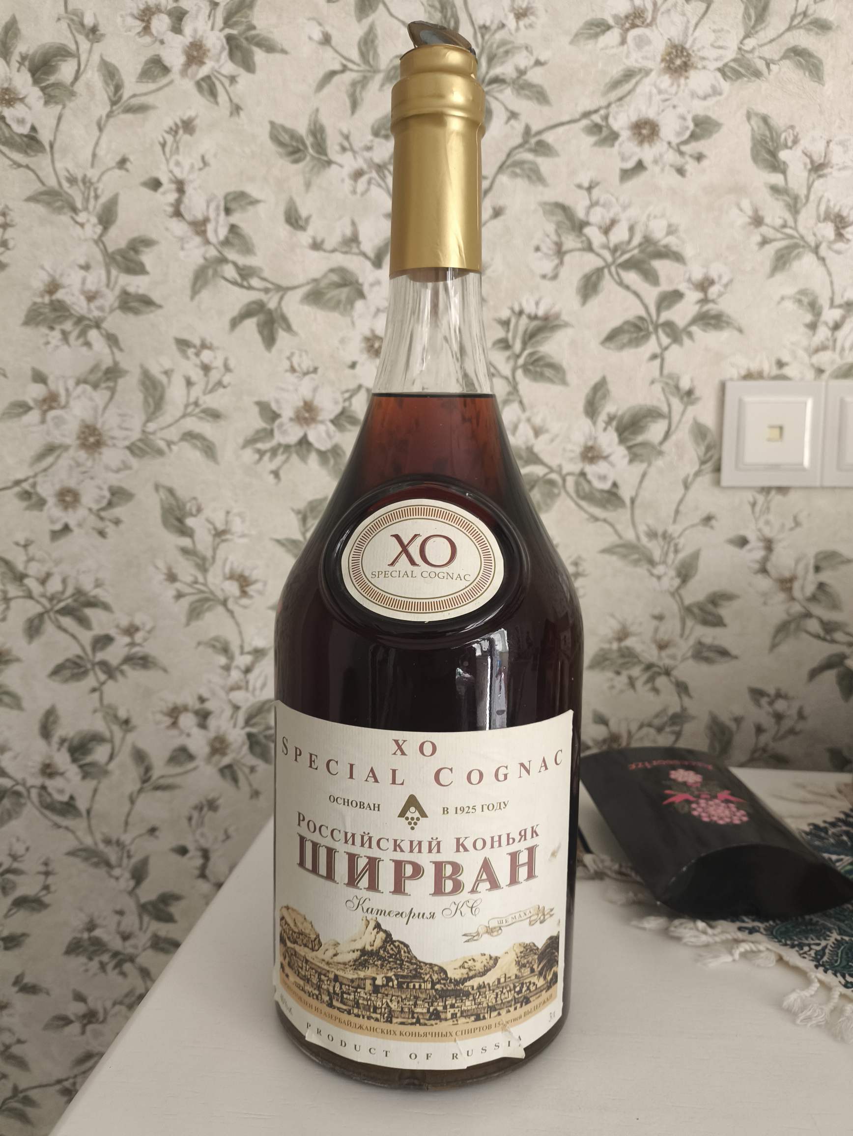 2. Коньяк Российский категории КС "Ширван" XO Spesial Cognac". По этикетке изготовлен из "Отборных Азербайджанских коньячных спиртов возрастом не менее 15 лет" производства ЗАО "Мосазеривинзавод". Объем 3 лтр. По легенде был подарен лично Тельманом Исмайловым на ДР уважаемому человеку (ныне покойному), выкуплен из семьи. Коробка вроде была большая, но мне досталась только открытая презентационная часть, в состоянии "неочень".