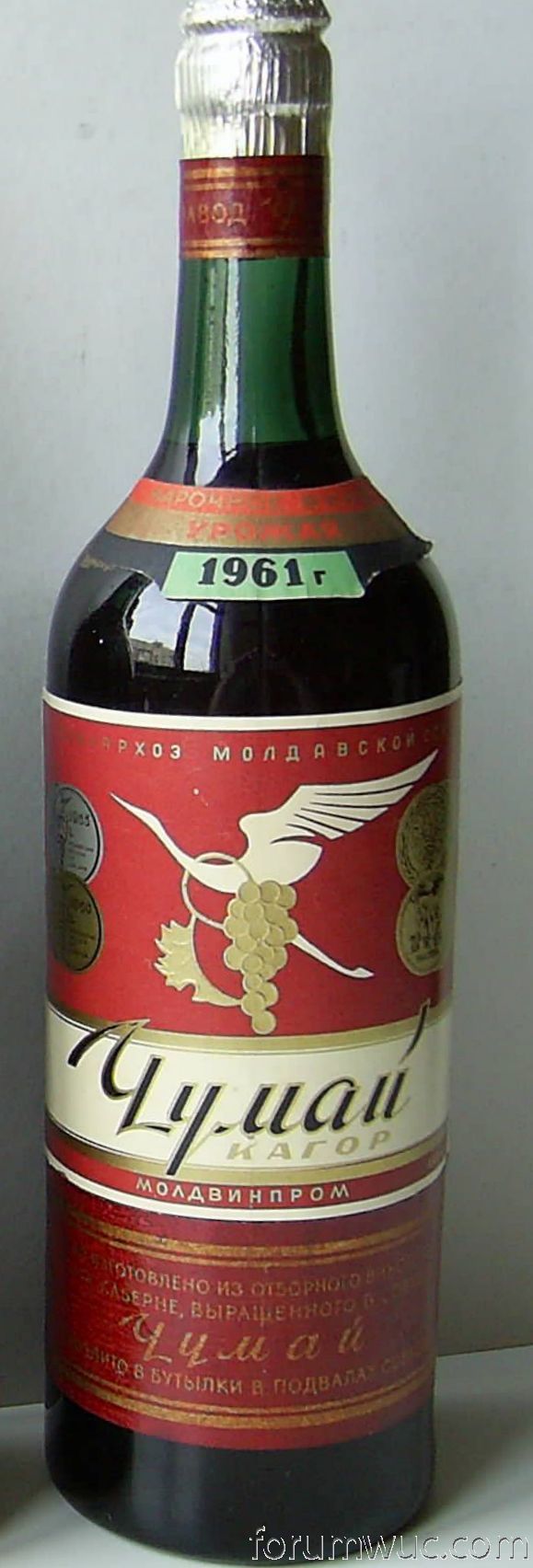Купил я его в 2009 году у одного из работников уже А.О. Чумай. Вино хранилось у него в погребе в количестве 4-ех бутылок. Открыли одну бутылку.Такого я не испытывал никогда - белый кагор со всеми ярчайшими вкусовыми характеристиками настоящего Кагор-Чумая!Это надо попробовать! Будет ,что рассказать внукам! Многим коллекционным десертным винам свойственно менять цвет с десятилетиями выдержки. И от этого вкус ни в коем случае не страдает , а даже наоборот ,появляется своя изюминка. Вспомнился Букет Молдавии Белый 90-тых годов рубинового цвета :). Две бутылки были проданы,судьба их неизвестна. Последний и Самый Старый кагор из сохранившихся до наших дней вин Чумая! Продается на аукционе:http://ussrwine.com/auction_details.php ... 2718baa975