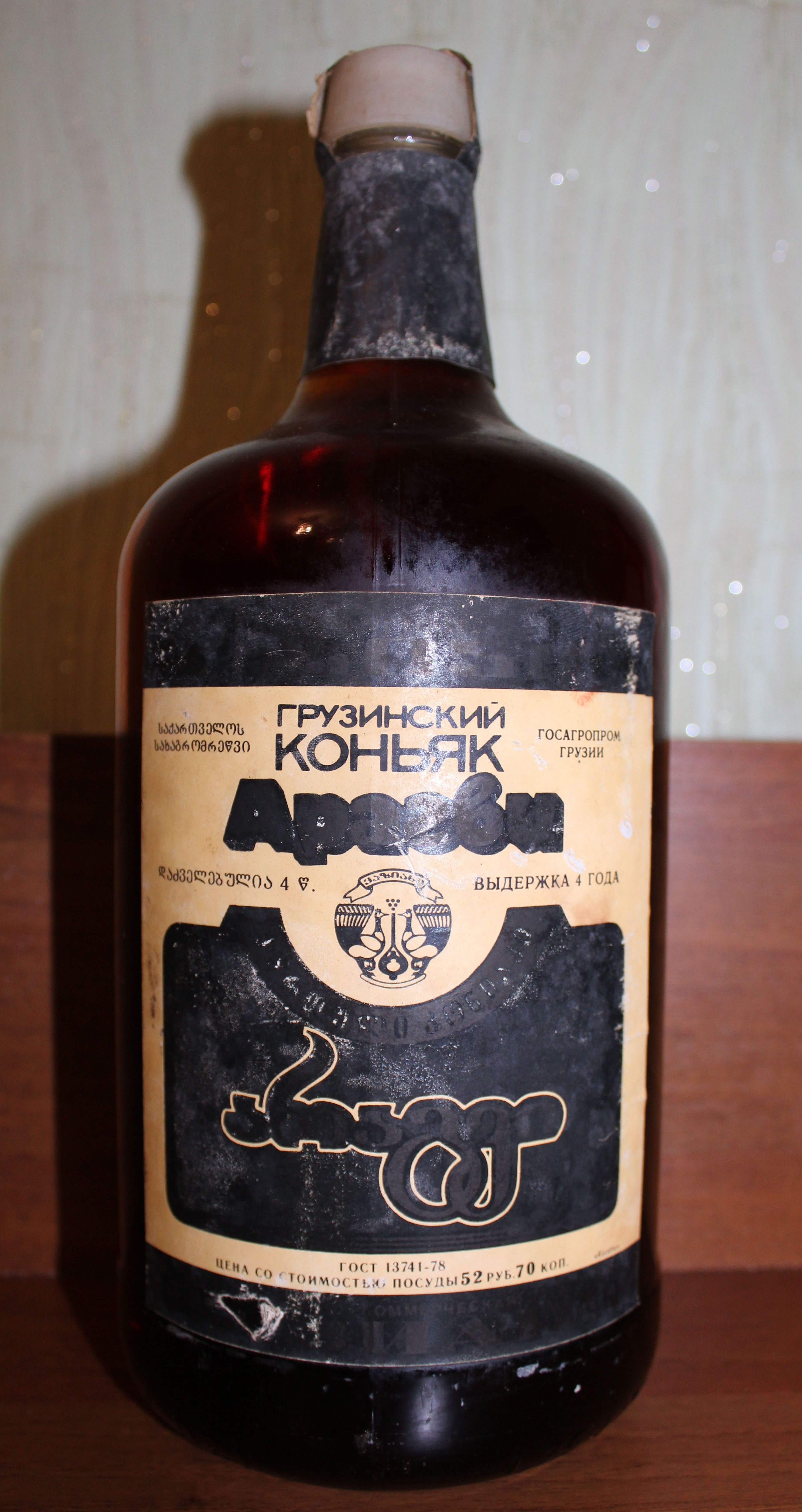 Помогите оценить грузинский коньяк "Арагви": - объем - 1,75 л, выдержка 4 года,ГОСТ - 13741-78, стоимость посуды 52 руб.70 коп. На дне дата не указана, только указаны объем и цена .