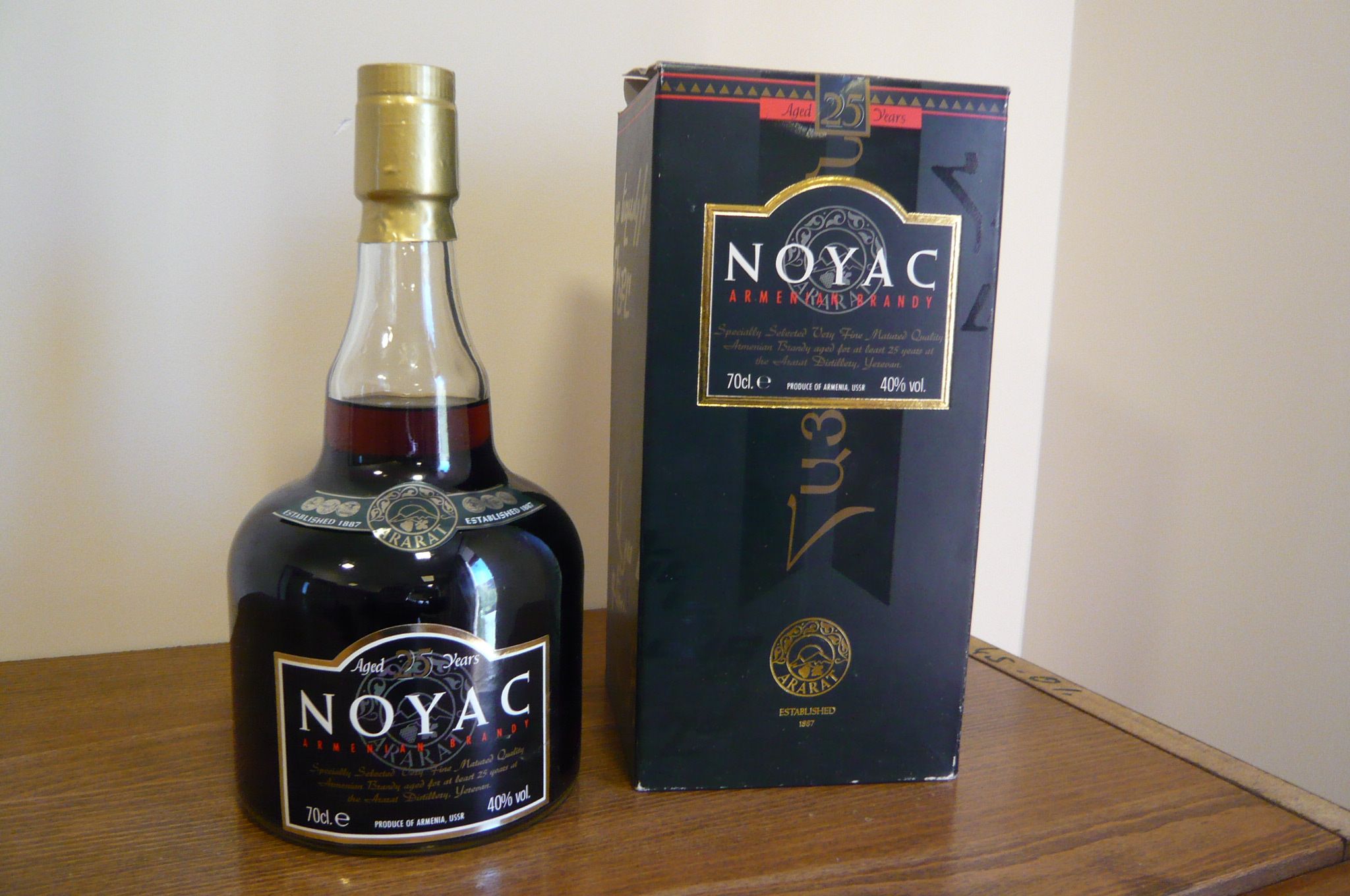 Раннее постсовестское (??) творчество - Ararat NOYAC 25 YO. Как гласит этикетка - армянский бренди, это понятно - на экспорт он не должен быть Коньяком. Также этикетка утверждает что это ещё USSR.