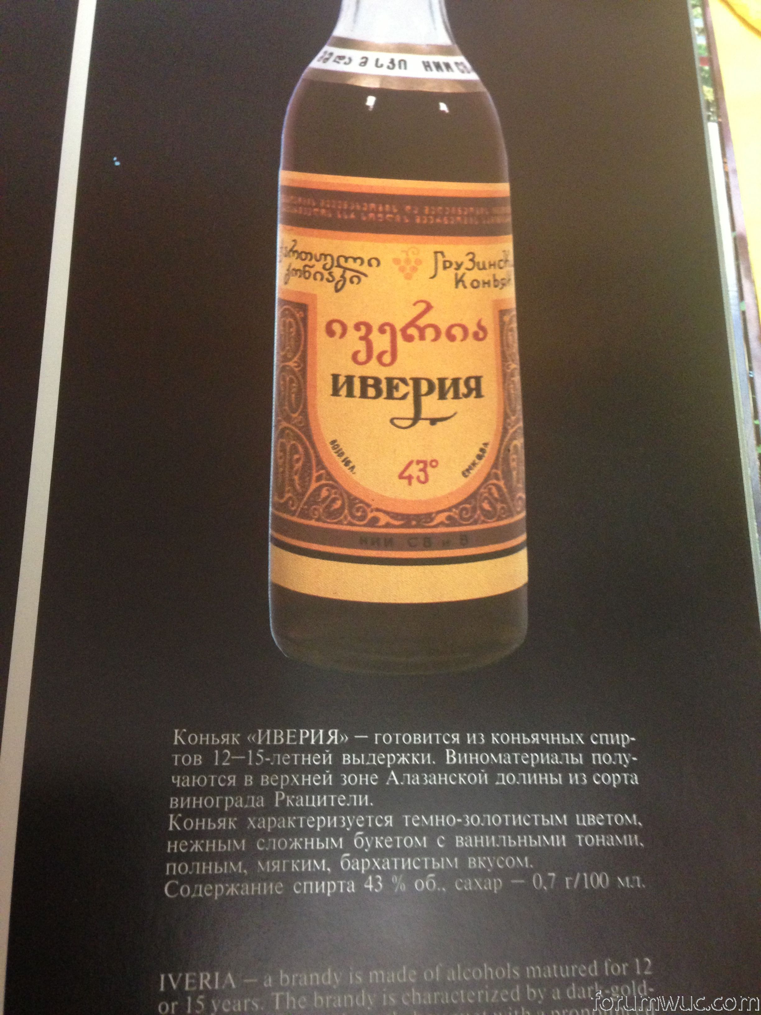 Владимир, был бы Вам очень благодарен ,если бы Вы фото Вашей бутылочки выложили. Как видите большим ассортиментом "Иверии" наш форум не загруженdesigner54 писал(а):У меня тоже одна такая бутылка. Надо сказать, что в то время, когда он производился, был самым редким коньяком. В продаже я его не видел НИКОГДА, поскольку выпускался он не самтрестом а НИИСВ Грузии и, очевидно, небольшим тиражом.