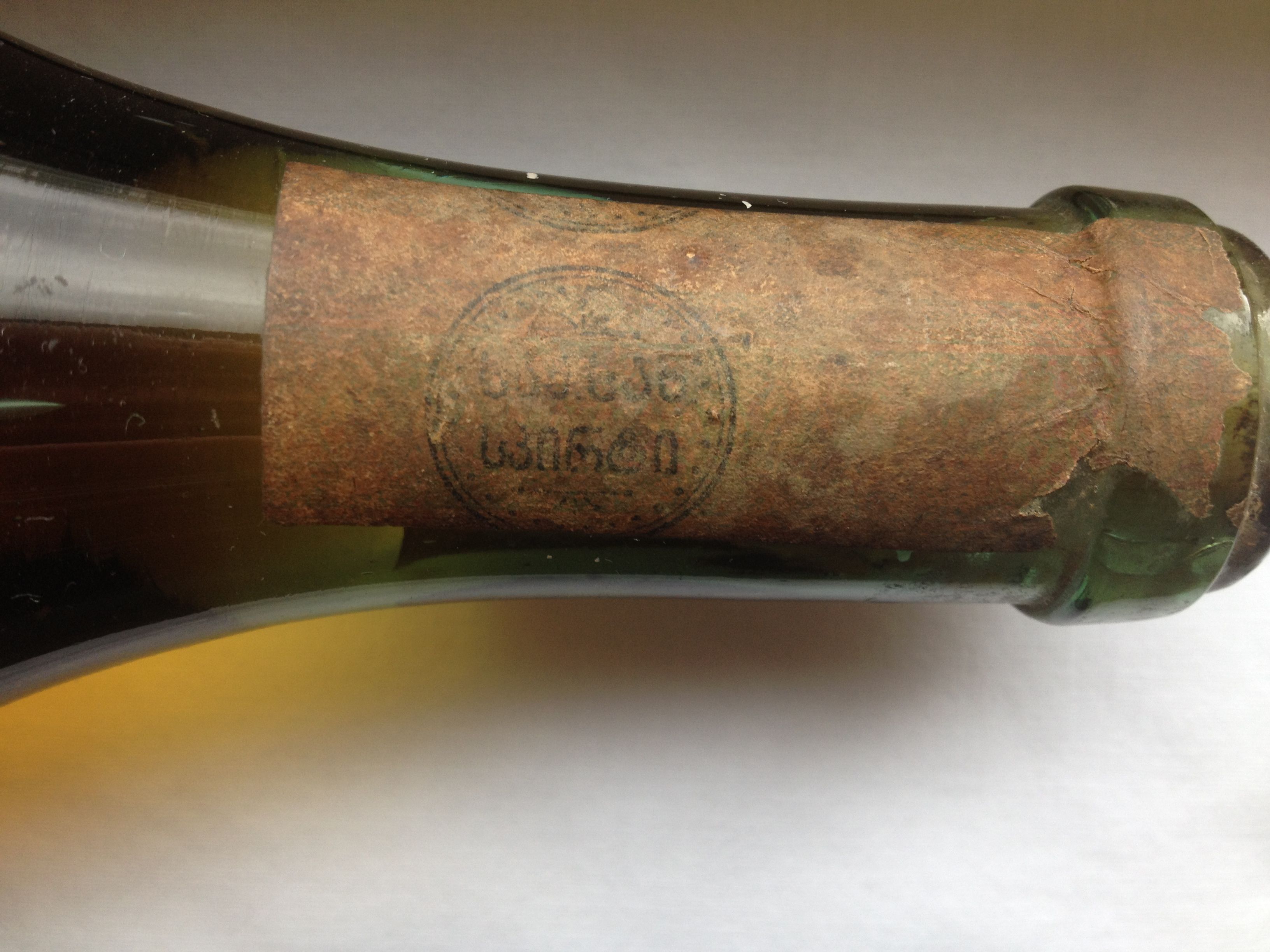 Номер марки "ОС" № 25, напечатанный красной краской, характерен для коньяков 30-х годов.