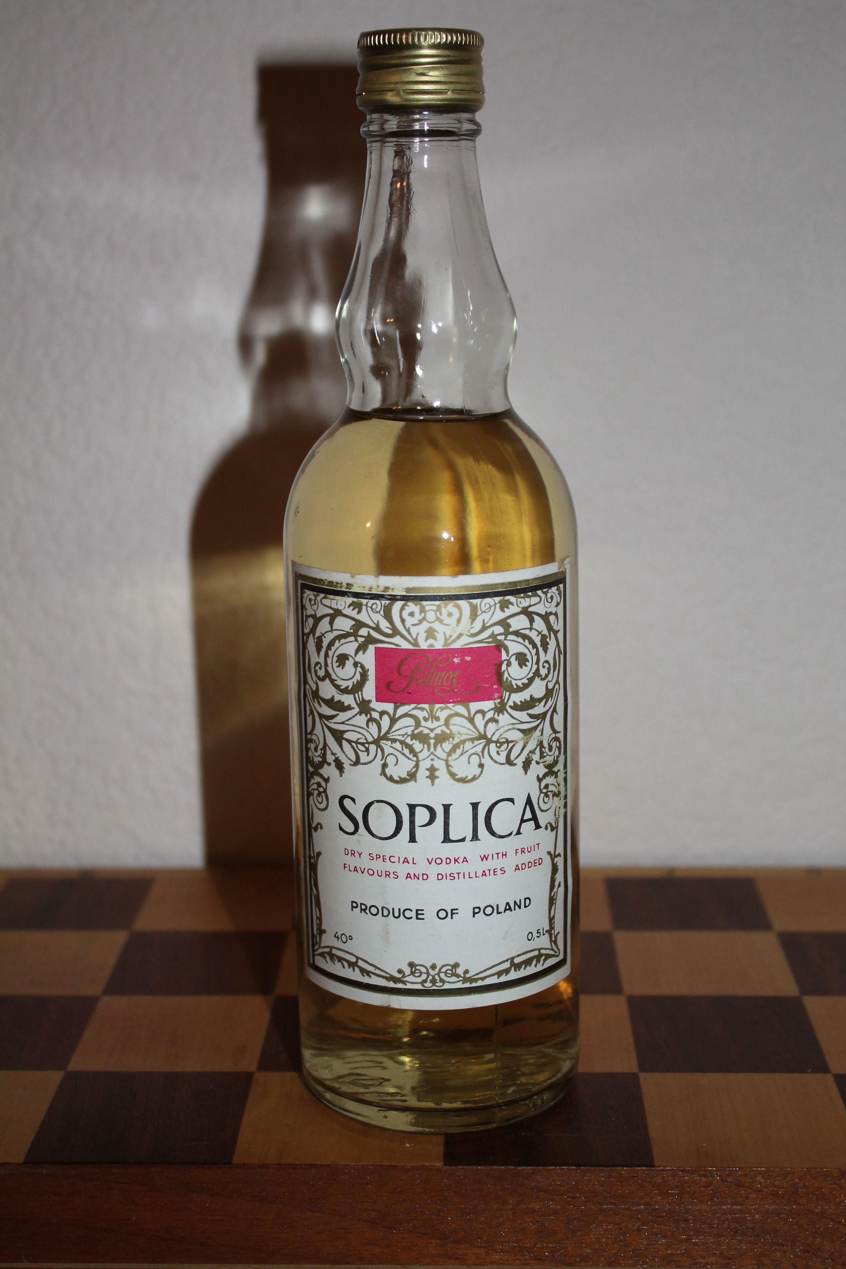 Несмотря на то, что ароматизированные виды "Соплицы" формально считаются в Польше наливками, данный экземпляр следует считать настойкой. Сорок градусов подтверждают серьезность намерений. В данное время наливки "Соплица" имеют 32 и 36 градусов.