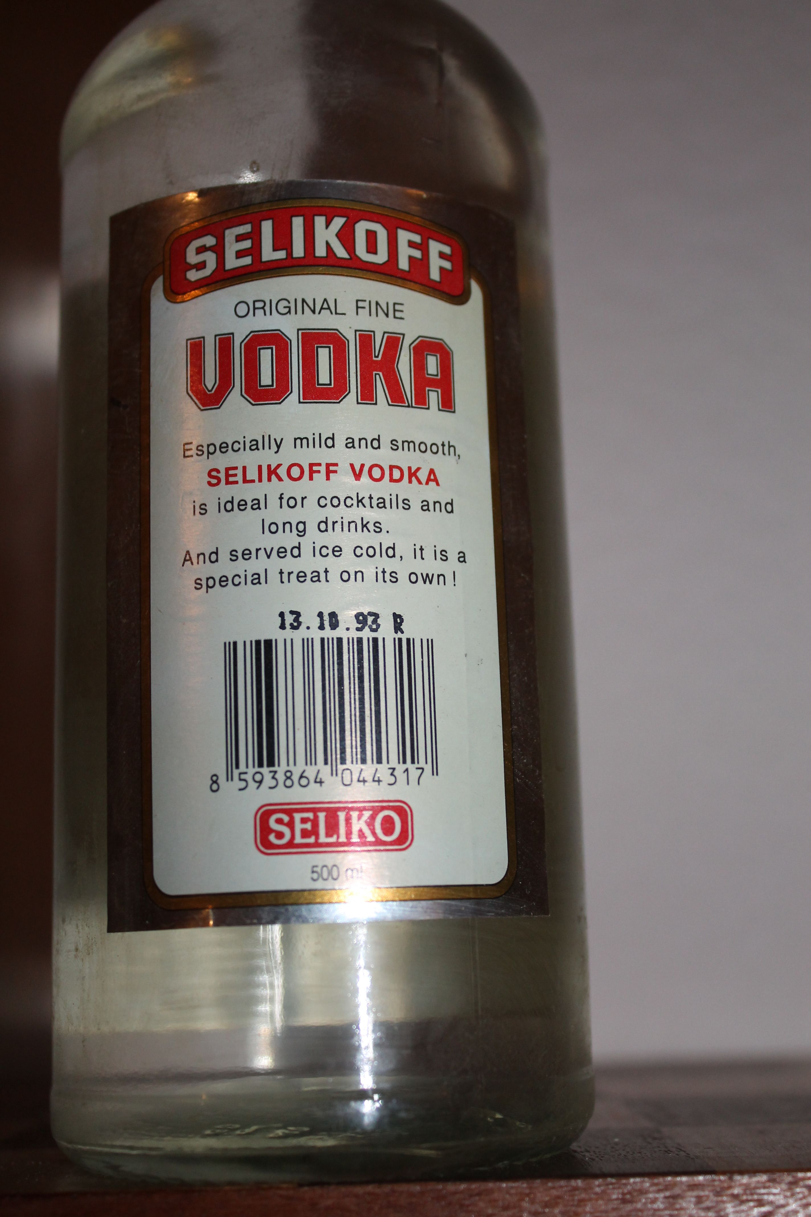 Конечно, в оформлении бутылки угадывается горячее желание прикоснуться к славе и успеху Smirnoff, тем не менее, это довольно узнаваемый и популярный бренд в Чехии и соседних с ней странах. Указана точная дата розлива 13.10.1993г.