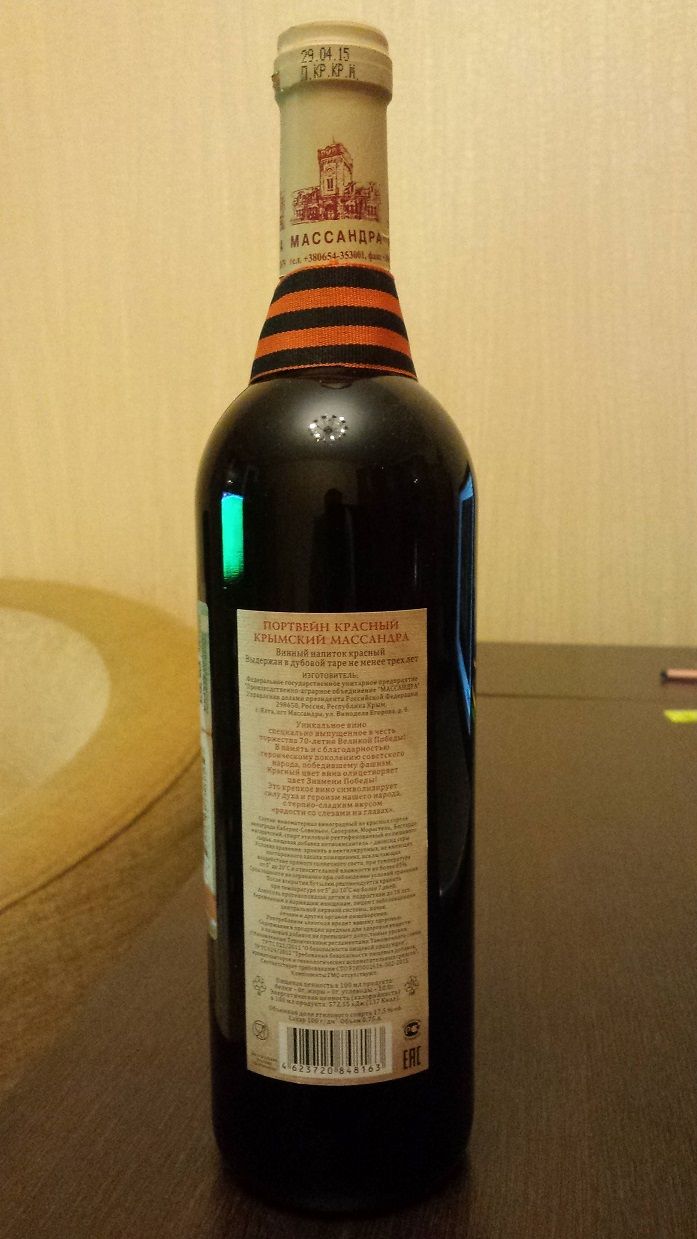 А у меня есть вот такой Портвейн Красный Крымский. Покупал в отпуске в Ялте в 2015 году, на заводе Массандра. Розлив 2015, хранение не менее 3 лет, значит 2012 год урожая.