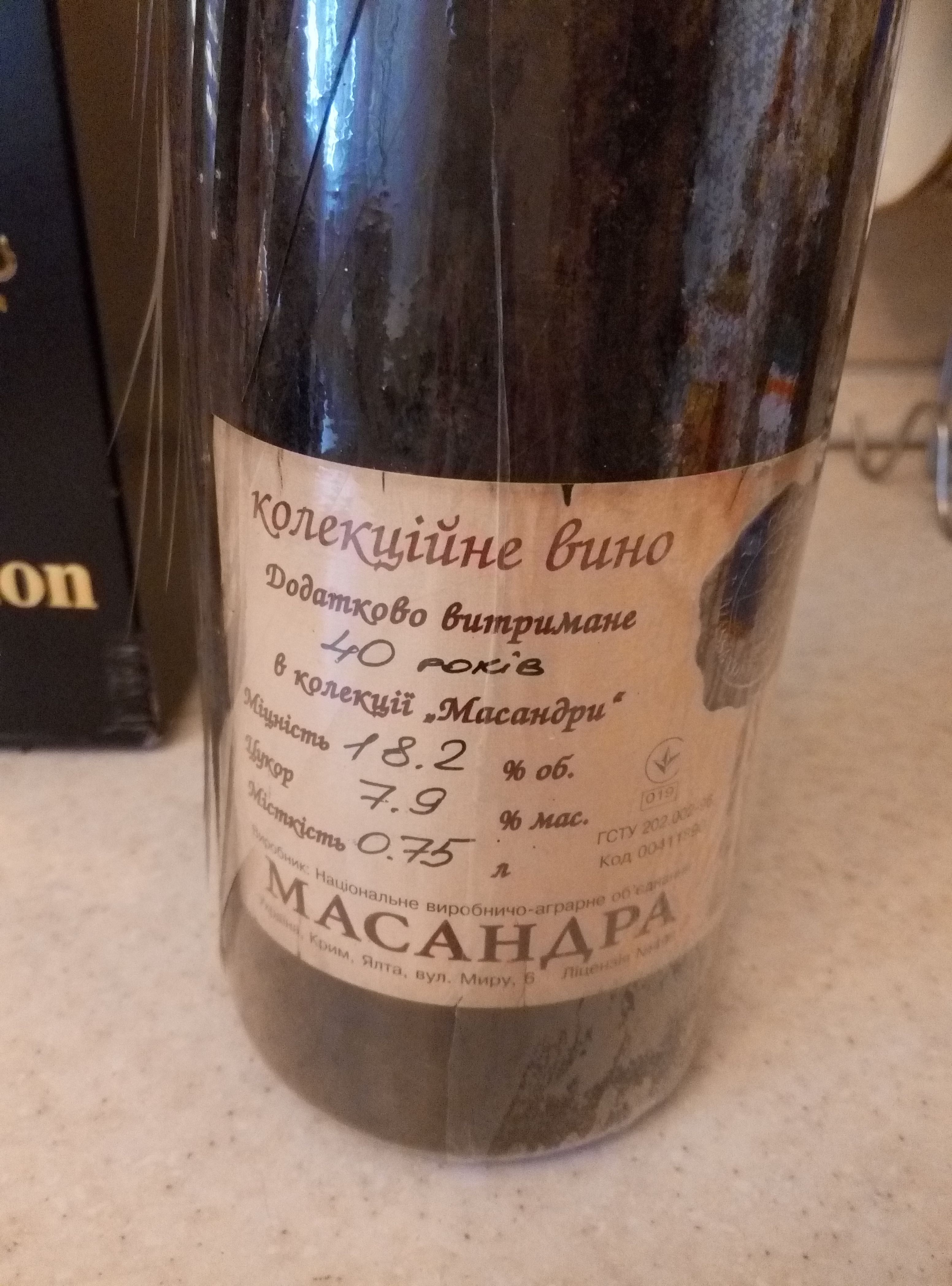 Помогите пожалуйста с оценкой данного вина, подарили дяде на юбилей , Портвейн, Масандра 1959, бутылка упакована в пленку, но от старости она немного потрескалась. Фото прикладываю ниже (пробку не видно к сожалению) :pardon: