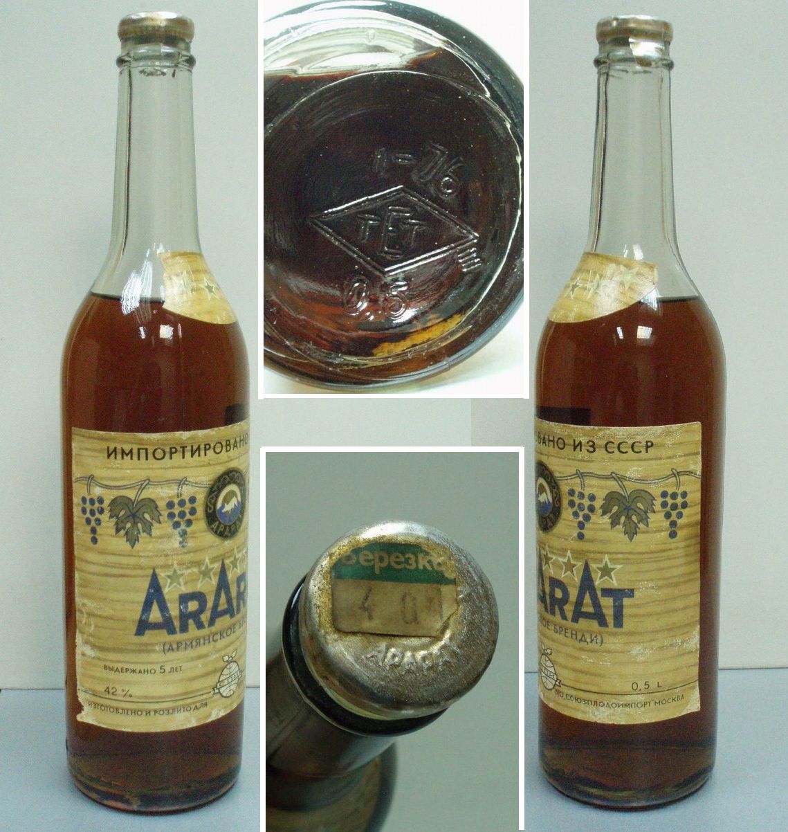 Попалась интересная бутылка, выдув бутылки 76 год, на обороте этикетке штамп также 76 года, этикетка потрепана. Оформление как у обычных экспортных "Ararat 5 star", но надписи по-русски. На пробке имеется наклейка "Березка".