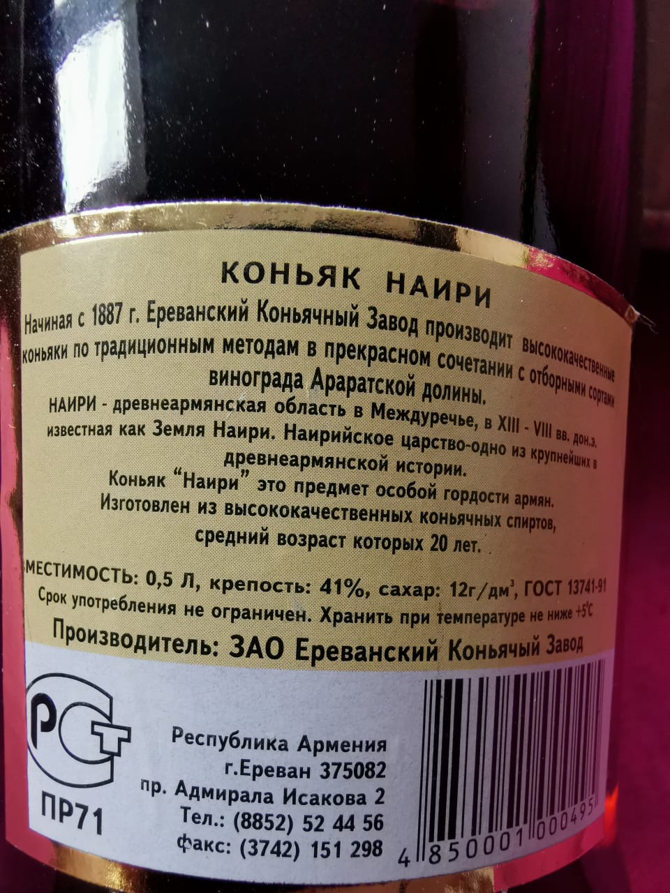 Добрый вечер, скажите пожалуйста у меня вот есть несколько бутылок коньяка Наири. Выдержка 20 лет. ЗАО Ереванский коньячный завод. Вместительность 0,5 л. Крепость 41% сахар 12г/дм3 ГОСТ 13741-91