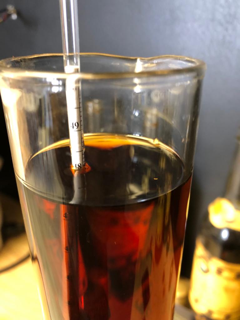 В мерном же цилиндре замеряю содержание спирта коньяка из доливной бутылки. Приятно удивлен - 48 процентов алкоголя. Уже не раз замечал, что уровень особо не влияет на концентрацию спирта. Конечно мерить ареометром, пусть даже профессиональным это не совсем точные результаты, но погрешность при 20 градусах цельсия от лабораторного метода составляет всего 1 градус ... не так уж и много. Я просто измерял этим ареометром стандартные заводские современные коньяки по 40 градусов, он показывал 39.
