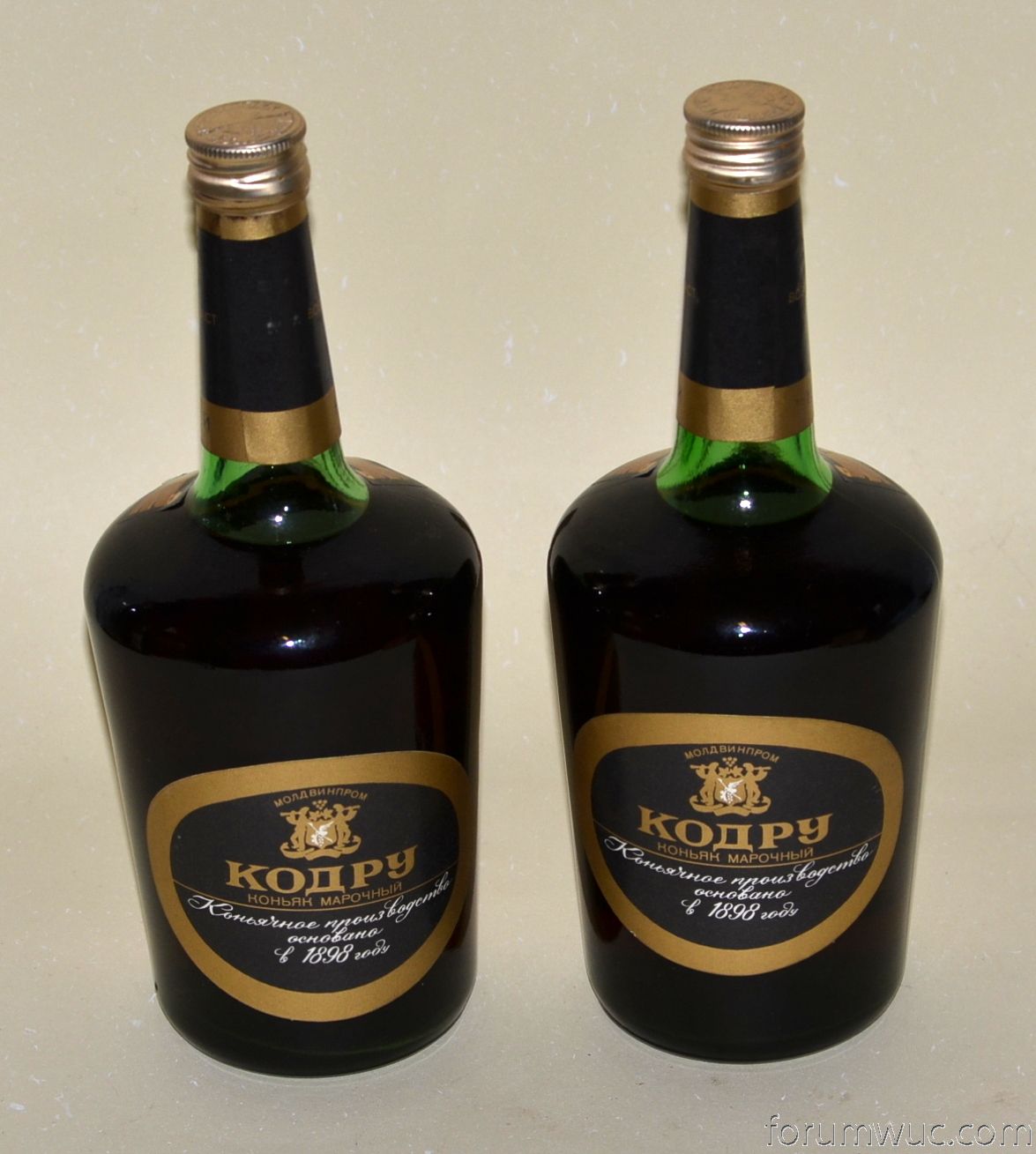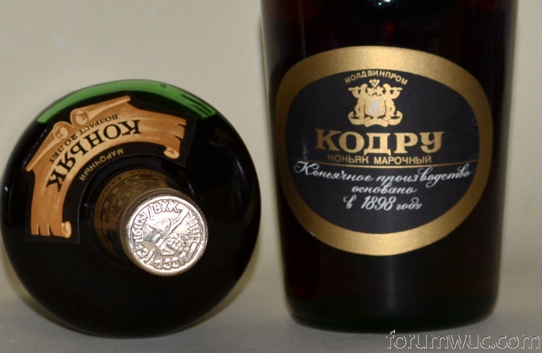 По Кодру.Пока мне встречались бутылки двух лет выдува 77 и 84-ый. Кодру что на фото avry относится к 84-88 году.Нет знака качества СССР(хотя дно 77). Знак качества на нем ставили до 1983 года . Точную дату розлива печатают на оборотной стороне этикетки , просветить фонариком или лампой не получается из-за контр этикетки. Раньше я проверял ее путем отмокания этикетки. Пробки встречаются двух видов: чистая и с тиснением бельцкого завода . Под винтовой всегда идет дубовая.Кстати!.! Бутылка 1986 года розлива у нас в Кишиневе ,в коллекции