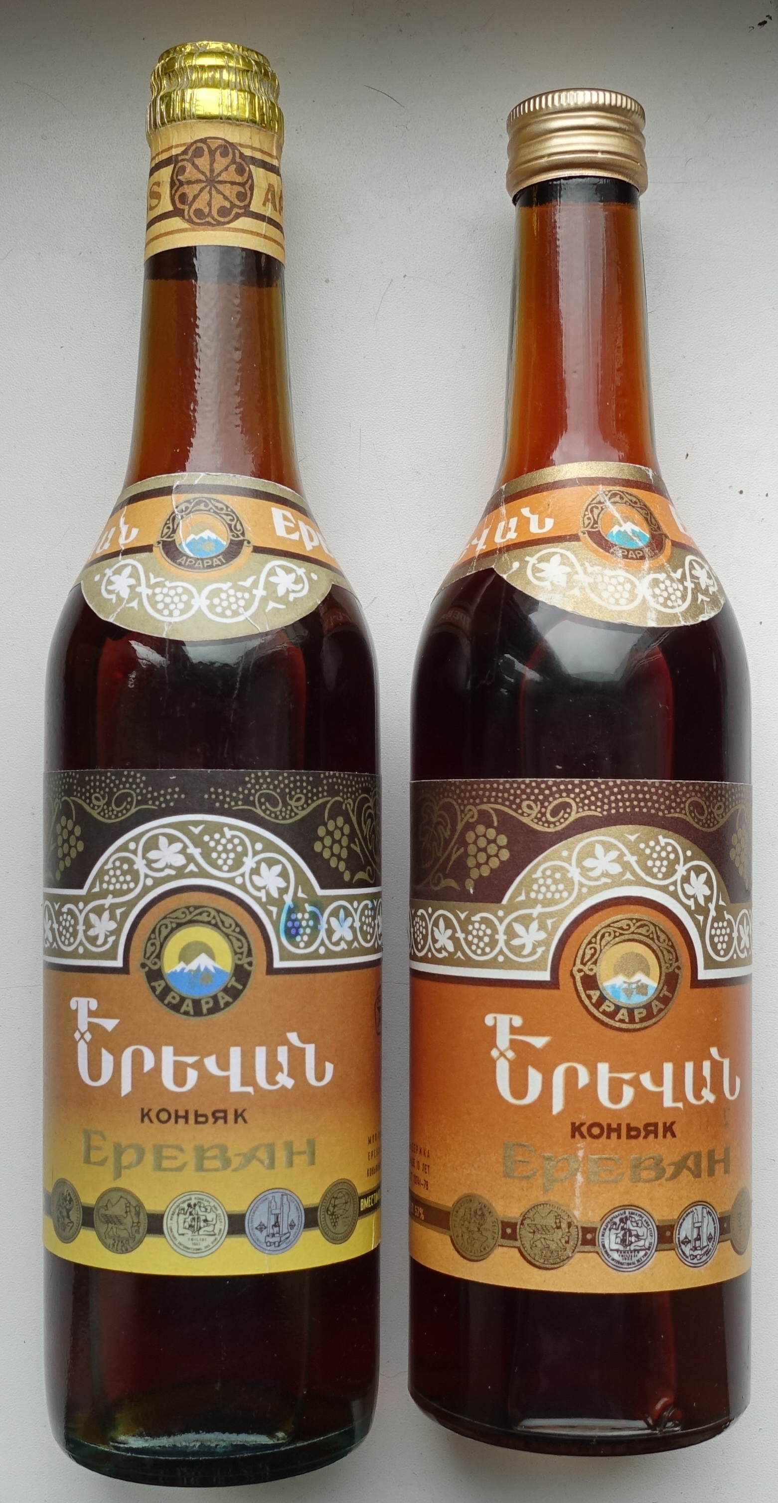 У одного этикетка тусклой печати, без золотой краски, с фольгированной укупоркой. На этикетке стоит МПП АрмССР, но бутылка имеет на донышке надпись на английском языке ARMENIA, чего никак не может быть на советской бутылке.