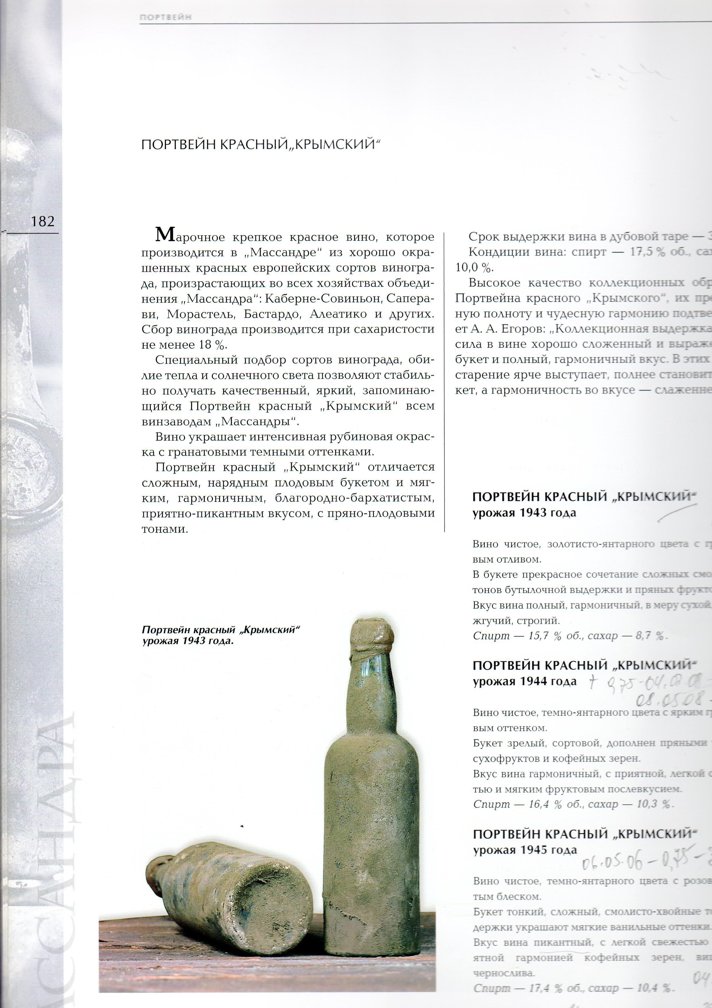 wuc писал(а):Портвейн красный Крымский, крепкое красное марочное вино. Вырабатывается с 1940 в совхозах винкомбината «Массандра» из винограда сортов Морастель, Цымлянский, Красностоп золотовский (30—40%), Алеатико, Саперави, Бастардо магарачский (10—20%) и смеси красных европейских сортов в сепаже (40—50%); в хозяйствах предгорной и степной частей Крыма — из винограда сортов Морастель, Саперави, Хиндогны, Алеатико, Матраса.