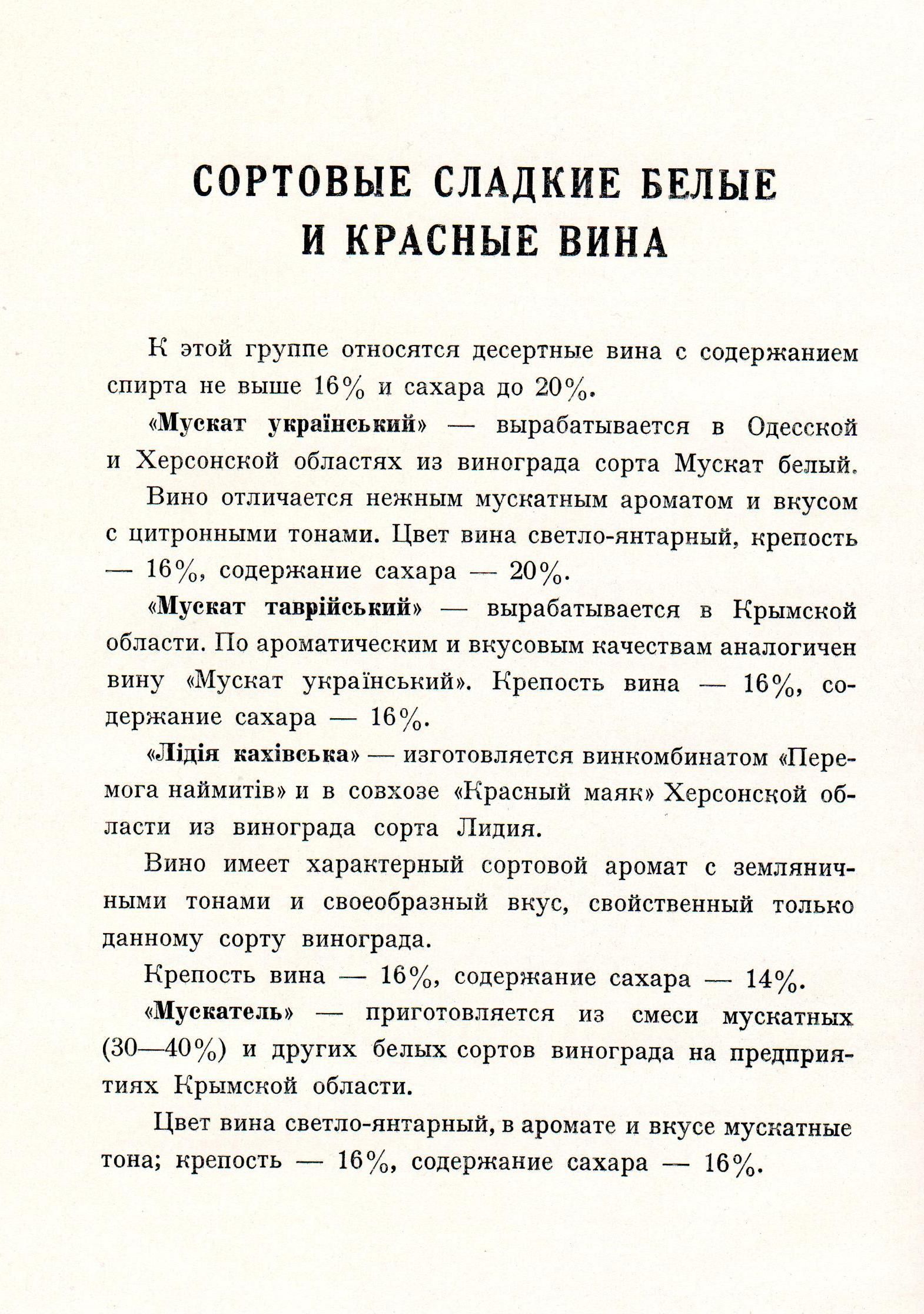 вино ординарное десертное из винограда сорта Мускат белый. Вино отличалось нежным мускатным ароматом и и вкусом с цитронными тонами. Цвет вина светло-янтарный. выпускалось с конца 40-х годов 20 века в Одесской, Херсонской областях с кондициями спирта 16 % об. и сахара до 20 %.gritsko писал(а):Да это именно название марки,правда про нее ничего неизвестно.