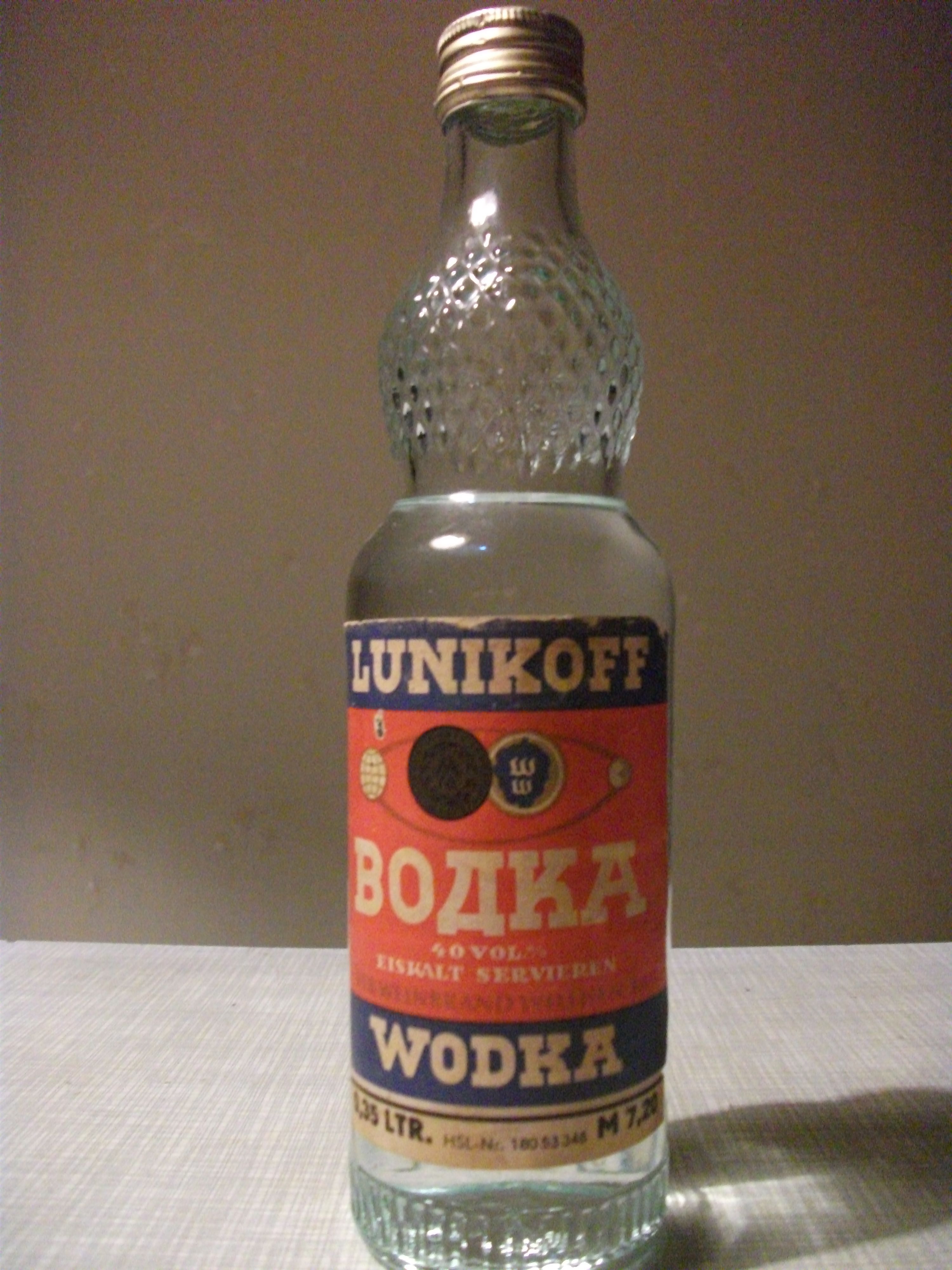 "Луникофф", 0,7 л. На этикетке изображена медаль Лейпцигской международной выставки 1968г. и указана стоимость 13,50 марок.
